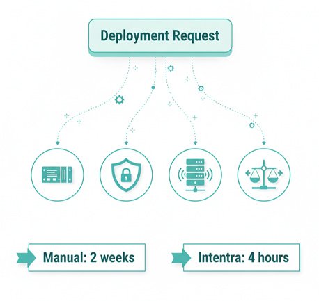 Issue reported → Intentra immediately identifies root cause across all systems → Routes to correct team with complete diagnosis and solution → Fixed in minutes, not weeks
